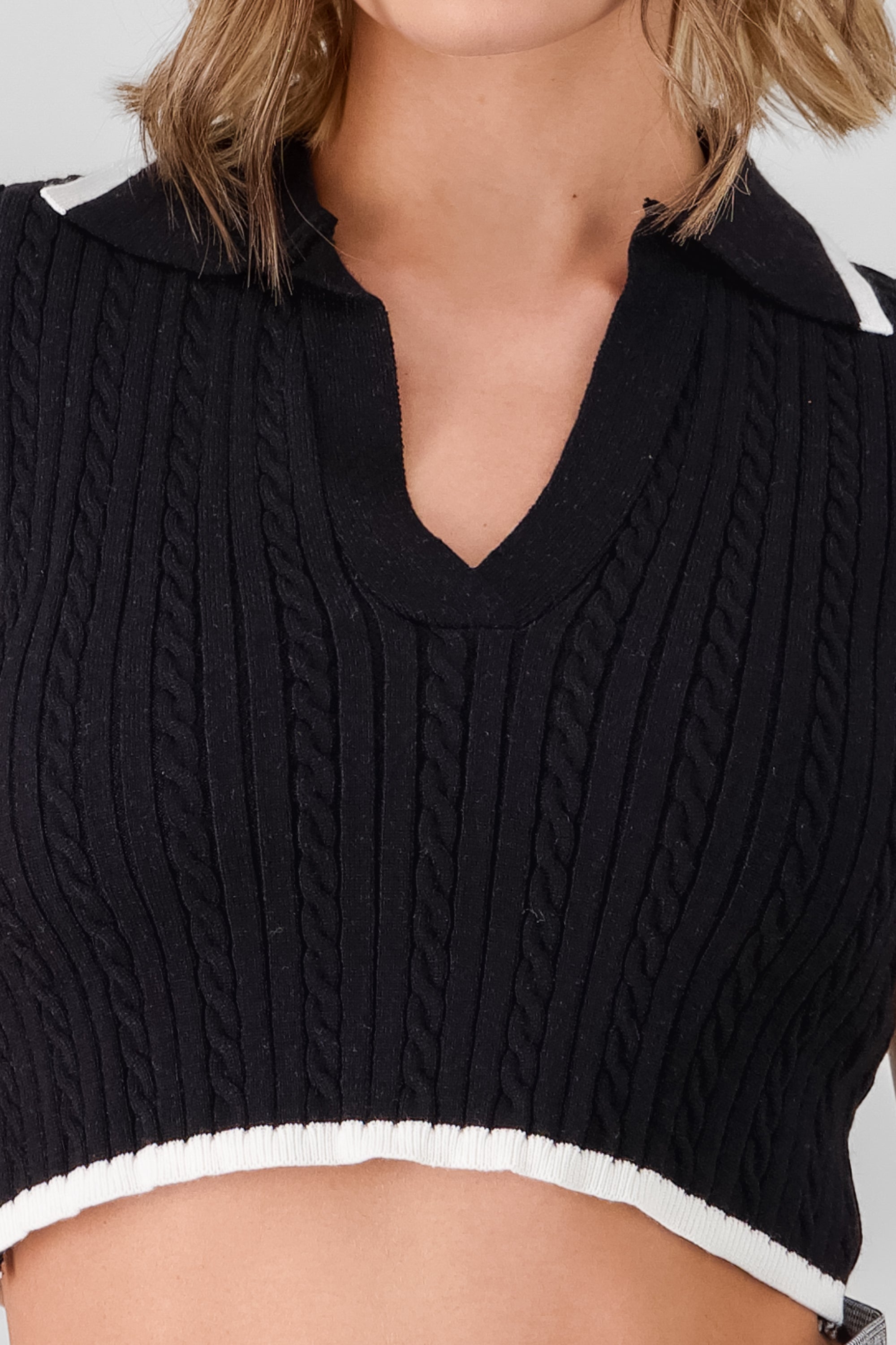Stay cozy and stylish with our Cable Knit Polo Crop Top! This unique top features a classic cable knit design and a trendy cropped cut. The contrasting piping adds a touch of modern flair. Perfect for pairing with high-waisted jeans or skirts.
