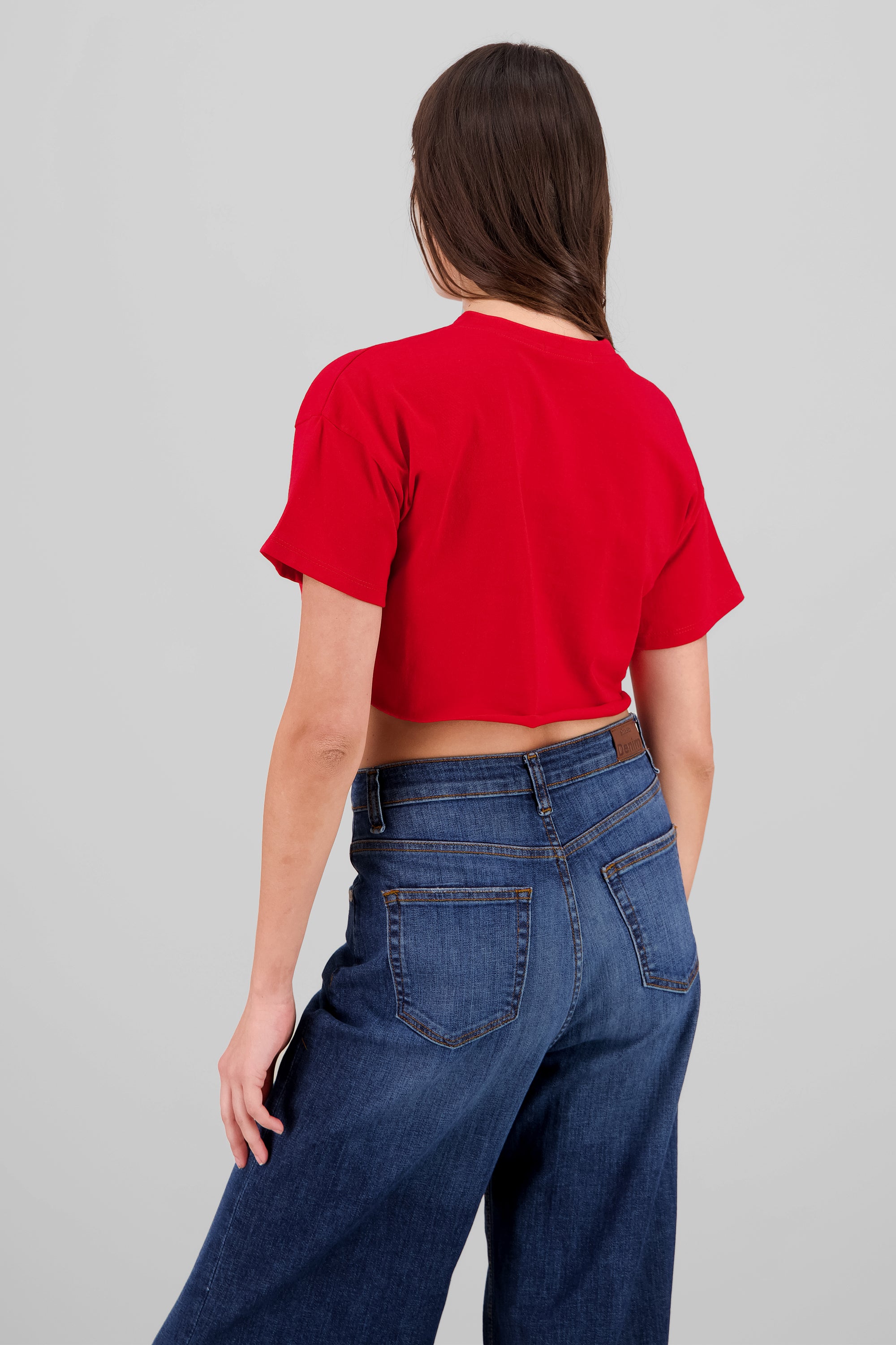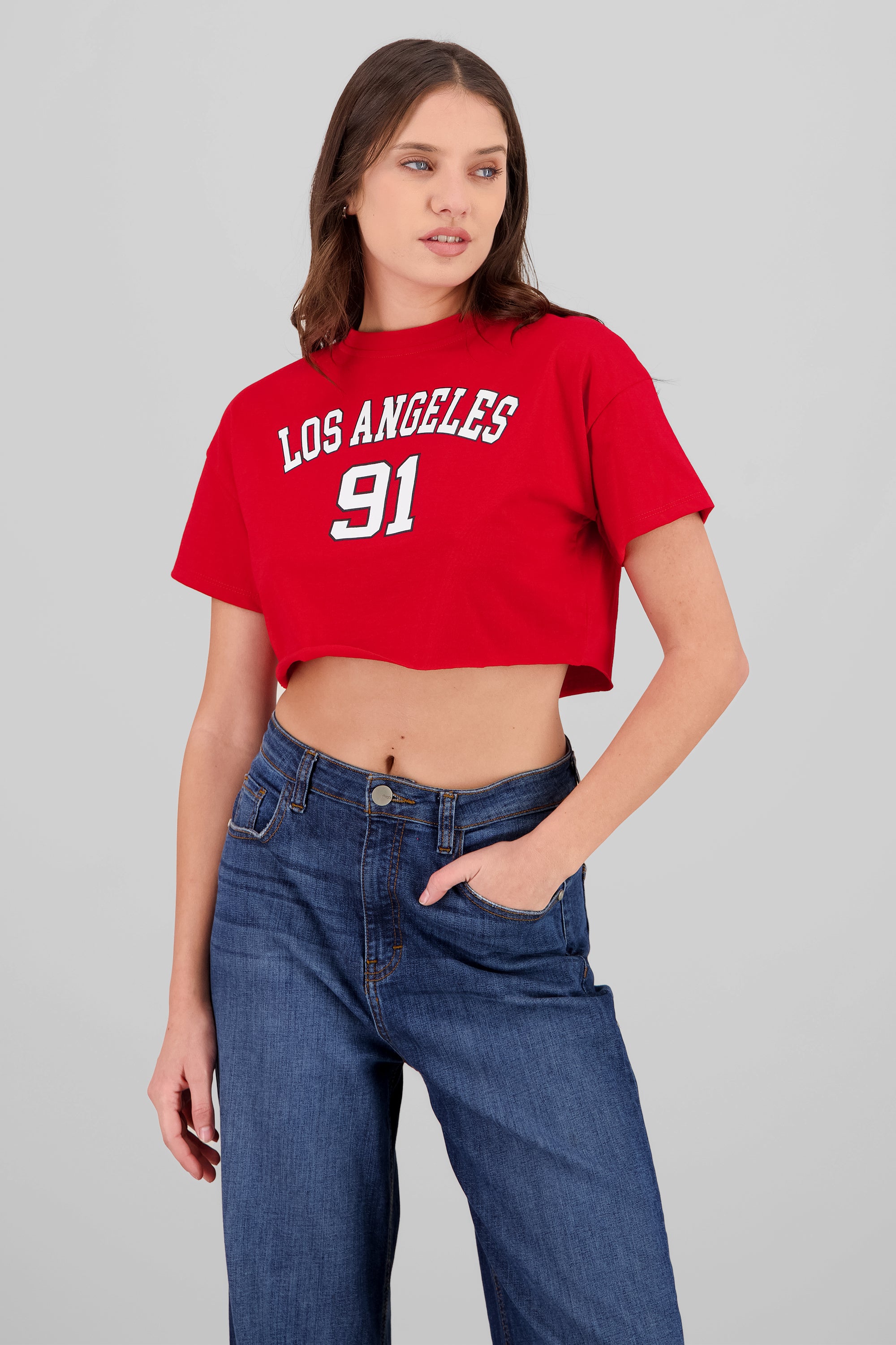 Stay trendy and comfortable with this short-sleeve crop top featuring a round neck design. The front of the top showcases a bold "Los Angeles 91" text print, adding a cool and urban vibe to your outfit.