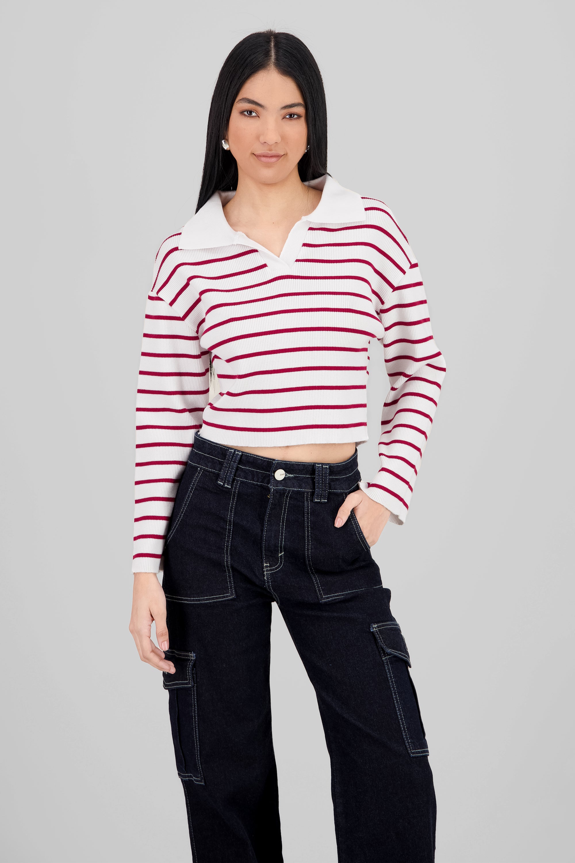 Striped Knit Polo Collar Sweater