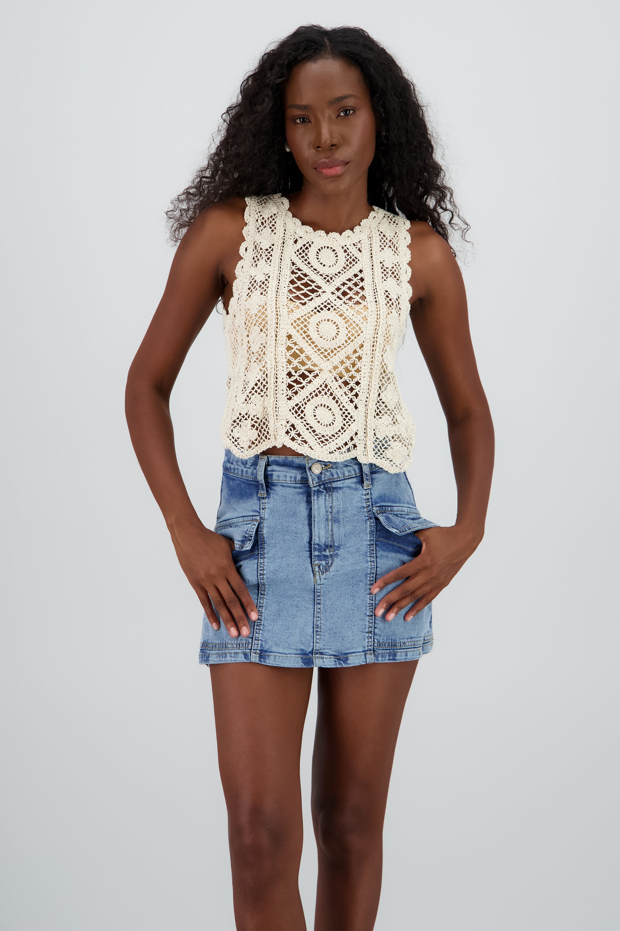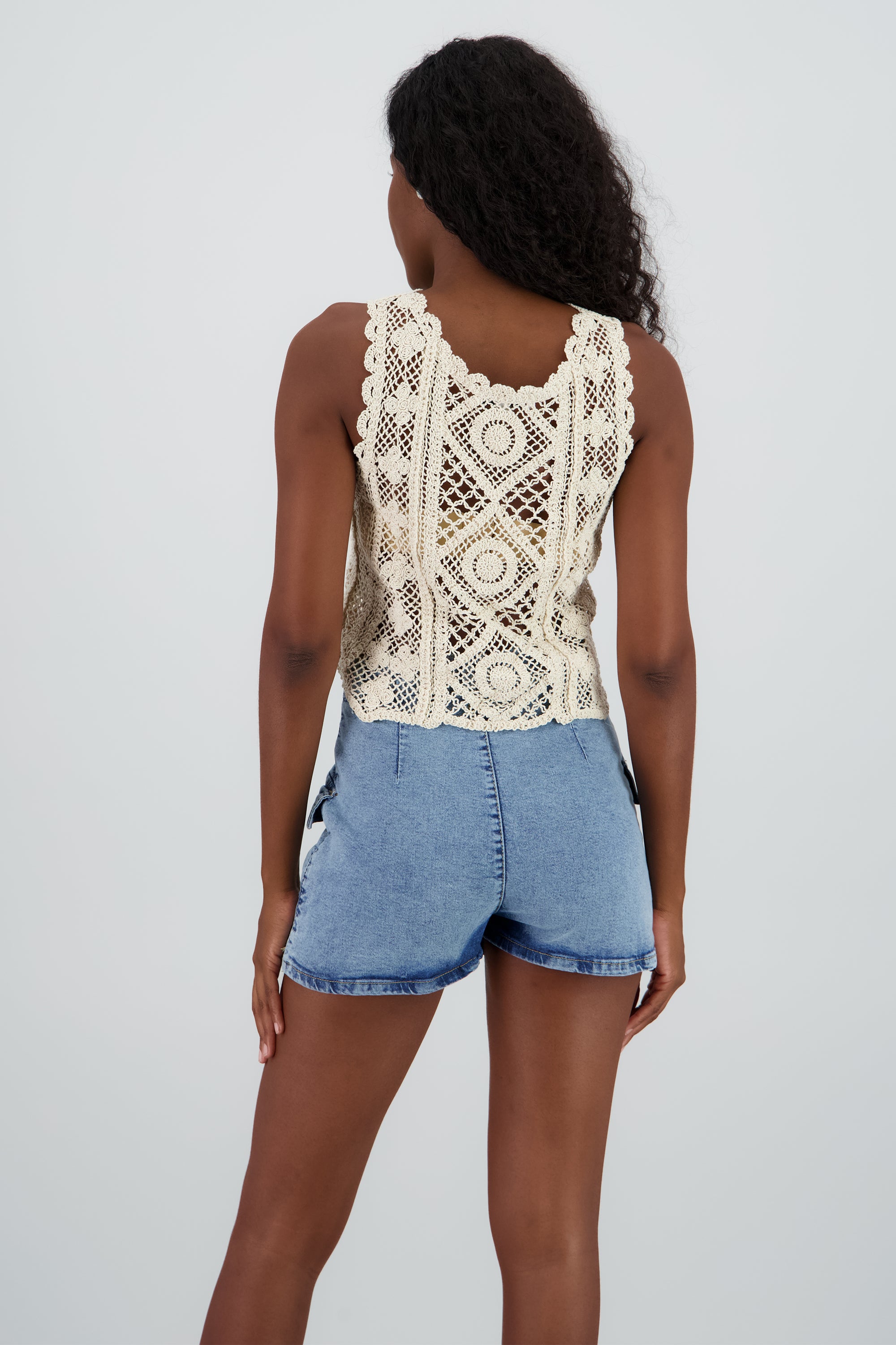 Crochet Blouse, made from a comfortable cotton blend, this sleeveless top features a unique crochet design and a scalloped neckline.