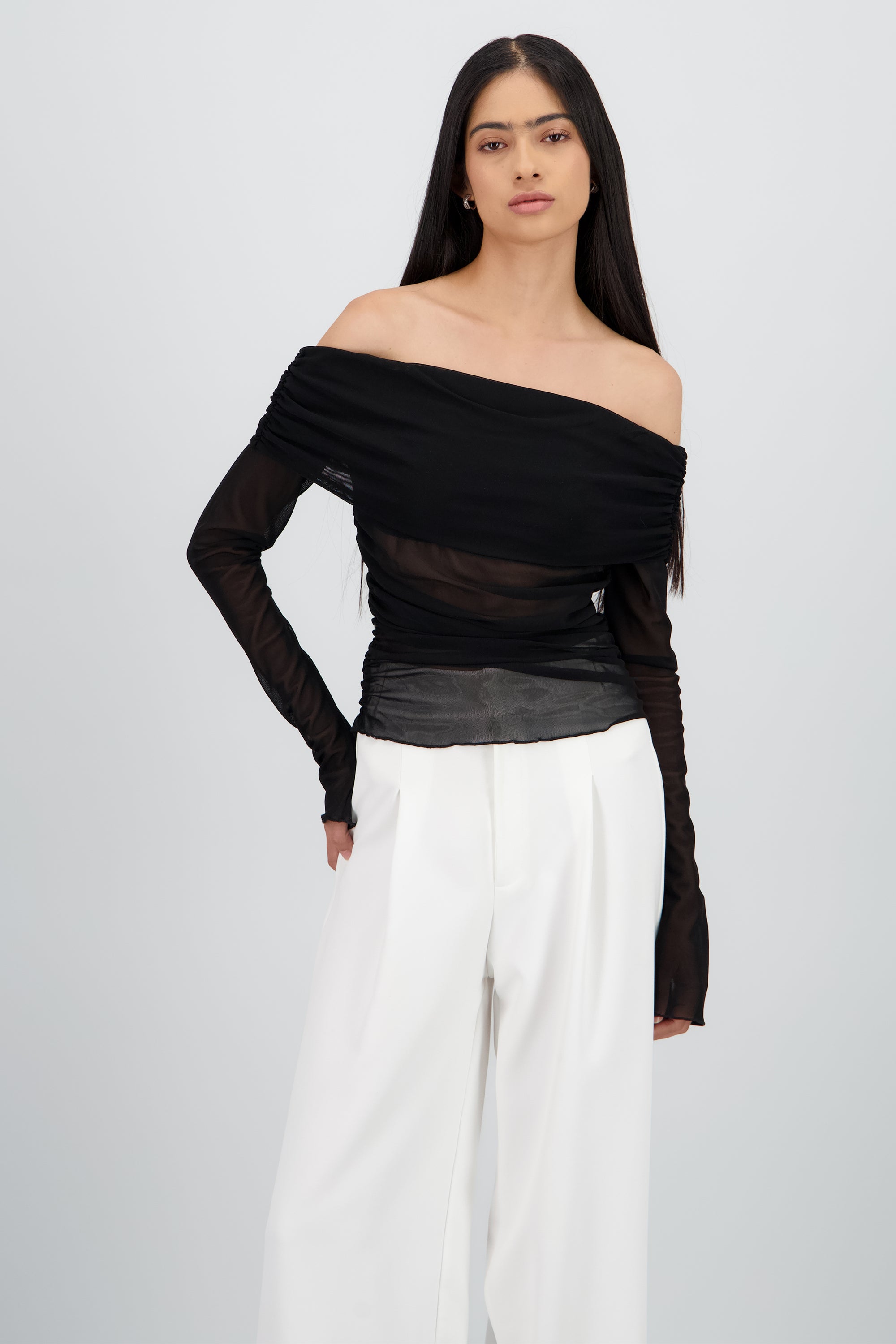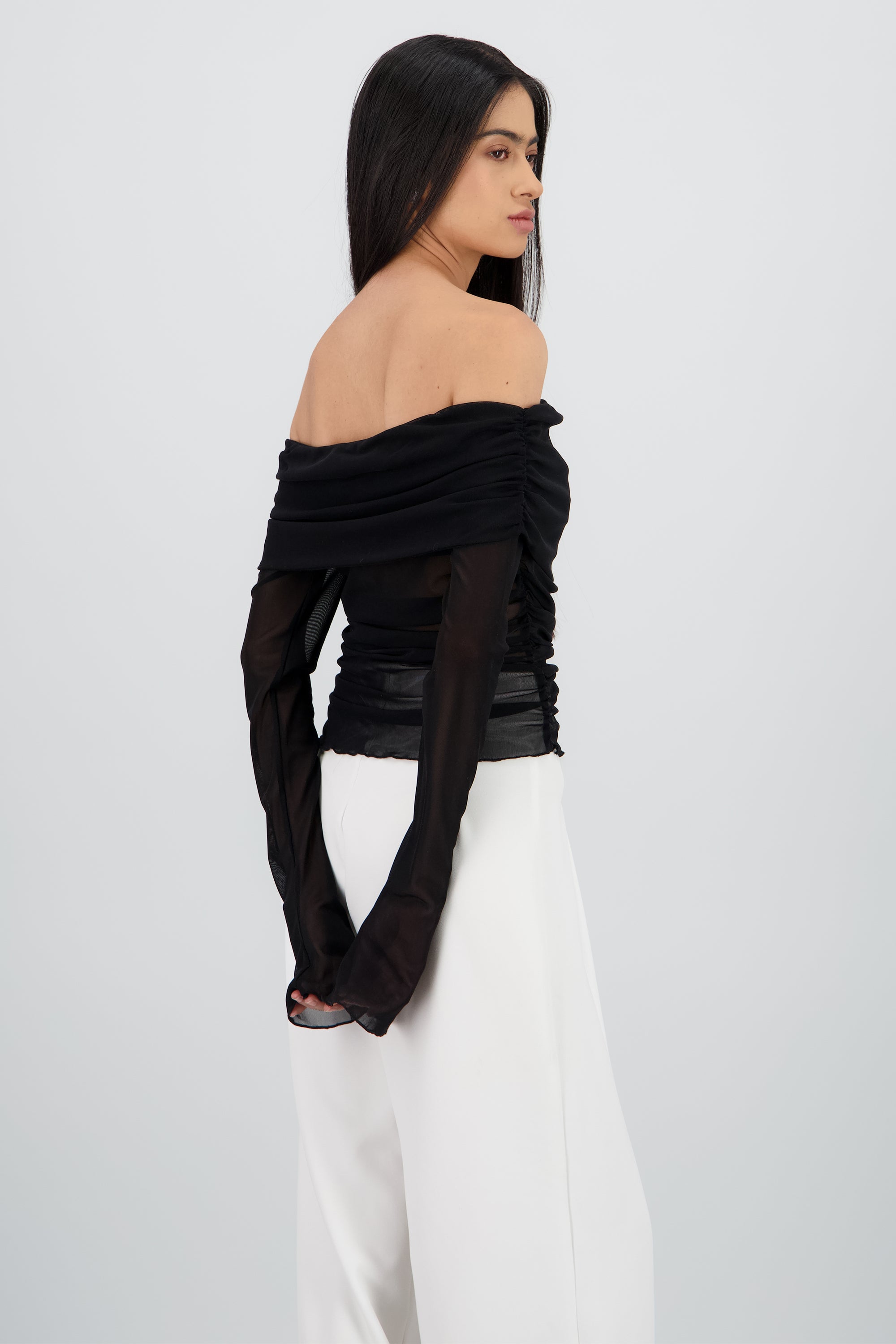 Off Shoulder Mesh Pleated Top